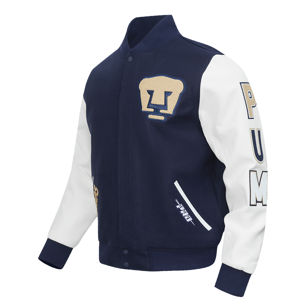 Chamarra Premium Pro Standard Liga MX Pumas UNAM Cuello tipo varsity Botones Frontales Mangas Largas con Detalles y Parches Bordados.