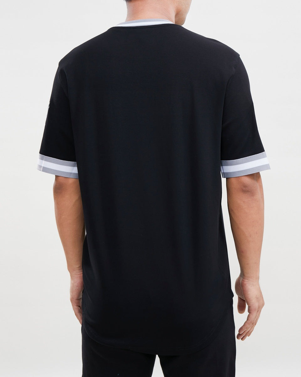 La playera de manga corta Pro Standard está confeccionada con un solo punto de algodón y presenta un bordado de puntadas satinadas 3D de sarga base y parches con el logotipo del equipo de primera calidad. La combinación de estos elementos crea una camisa única y llamativa que seguramente llamará la atención. Ya sea que te estés vistiendo para salir por la noche o simplemente estés buscando una camisa informal nueva y genial, nuestra camiseta es la elección perfecta.