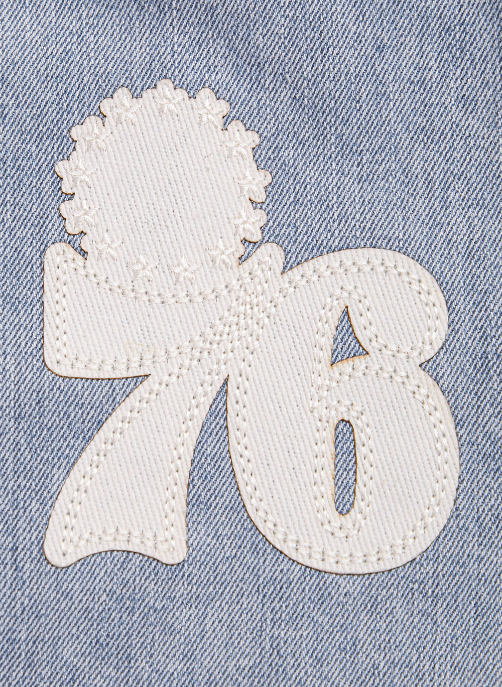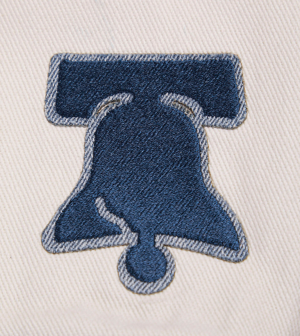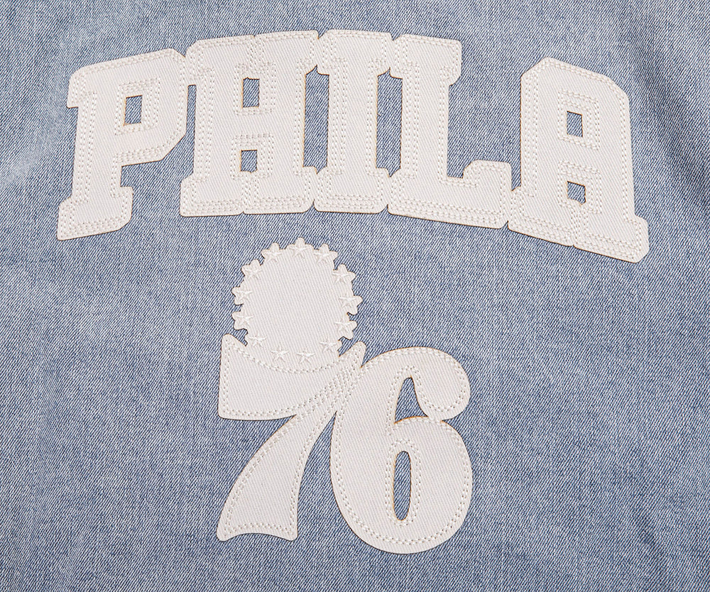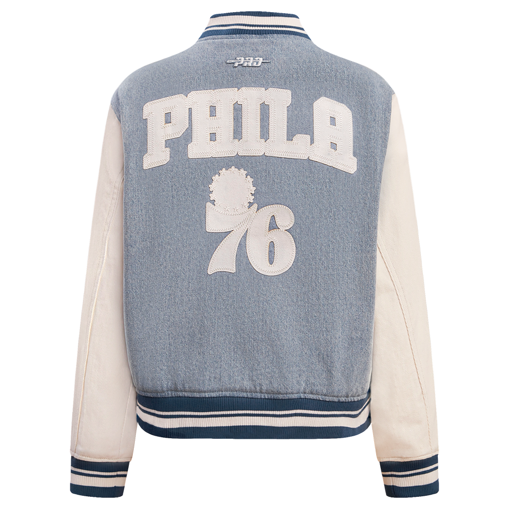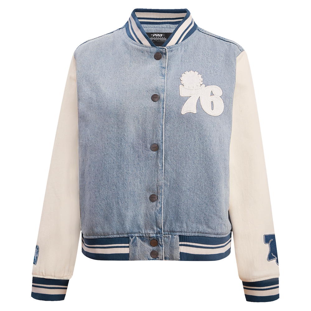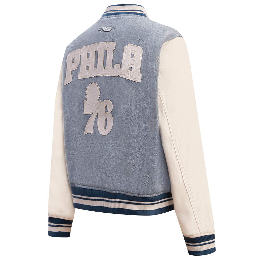 Chamarra Premium Pro Standard NBA Philadelphia 76Ers Varsity Blues Denim Varsity Jacket Para Mujer